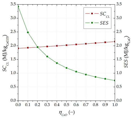 In more detail, for SCCL, the lower the inert solid input into the calciner, the greater the amount of carbonated material to be calcined. For SES, its highest value was almost 5 times the value obtained when no separation () is considered (0.7 MJ/kg CaO). On the other hand, the influence of a higher carbonated material ratio () on both variables (and SES) was minimal, reaching a defined value within all ranges of the lower carbonated material ratio (i.e., = 2 MJ/kg CaCO3 and SES = 1.1 MJ/kg CaO under of 0.5 and from 0 to 1).
