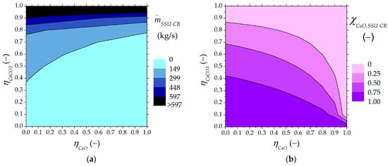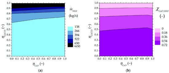 Solids leaving the SSU directed to the carbonator as a function of higher and lower carbonated material ratios: (a) output flow rate from the SSU to the carbonator, (b) mass fraction of unreacted CaO in the SSU output stream recirculated into the carbonator.