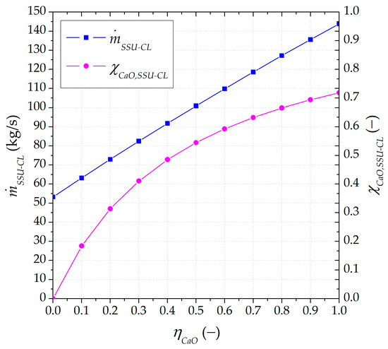 The values for the solid stream recirculated into the carbonator are illustrated in Figure 6. The smaller the carbonated material flow rate that is recirculated into the carbonator, the larger the avoided unreacted CaO material circulating between the reactors.