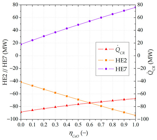 Two parameters were defined to assess the specific terms of energy influenced by the different effectiveness of the partial separation of the carbonated material: (i) the specific thermal energy consumption in the calciner and (ii) the specific thermal and chemical energy storage. The specific thermal energy consumption in the calciner (), Equation (9), indicates the thermal energy requirements to preheat the input solids to the calciner from 850 to 950 °C and the calcination reaction demand per CaCO3-based stream fed to the calciner. In Equation (9), represents the preheating heat power, while is a molar flow rate.