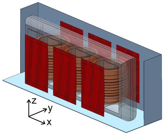 Geometry of vertical tank shields (red) in the power transformer. The co-ordinate system used in the models throughout the paper is shown in the figure.