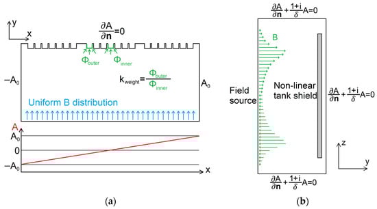 is imposed in the vertical 2D FEM model with non-linear tank shields (see Figure 4b). The parameter in Expression (5) is the width of the shield stack. In the vertical 2D FEM model (plane y–z in Figure 1), the tank is represented by the outer boundary where the surface impedance boundary condition is applied (top, bottom, and right boundary in Figure 4b). The flux density distribution is imposed on the left boundary (marked by green arrows in Figure 4b), as proposed in Section 3.4. The y-co-ordinate of the left boundary is the same as in the model for the weight factor calculation.