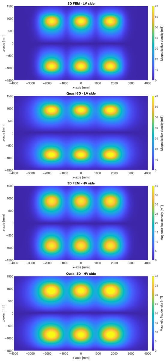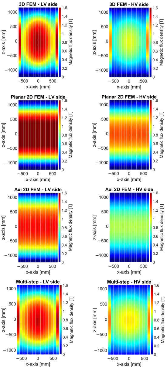 The proposed approach is used to calculate the magnetic flux density in tank shields on the example of a real three-phase power transformer geometry. The flux density is calculated on both the low-voltage (LV) and high-voltage (HV) sides. For this particular transformer, eighteen 2D FEM models were used in the multi-step approach. These include a quasi-3D model, a model for the weight factor calculation, and sixteen non-linear models for each shield stack. The detailed geometry of the transformer is confidential data. Therefore, only some basic information about the transformer is given in Table 1. The results of the proposed approach are compared against the results of the 3D FEM calculation.