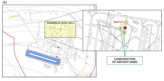 In their largest scope, modifications to the ventilation network will consist of closing Shaft IV combined with converting Shaft III from a downcast to an upcast one. This will require considerable changes to the ventilation network, including the installation of a primary fan station in the vicinity of Shaft III. These modifications will have a great influence on the distribution of air flow in the ventilation network. The most considerable adaptations will be required in the shaft bottom areas of shafts I, II, and III on every level. This need results from the fact that the shafts are arranged as twins and are linked to the workings on all active levels. Substantial changes will occur in the workings situated between the converted Shaft III and the closed Shaft IV. The scope of the necessary changes, consisting of isolating Shaft III with dams from the other excavations at the levels of 450 m, 650 m, and 850 m is presented in Figure 8a–c. At the level of 650 m, separate ventilation routes of return air will have to be assured to transfer the air to the converted Shaft III. A simplified scheme of the ventilation network after closing Shaft IV combined with converting Shaft III from a downcast to an upcast one is presented in Figure 9.