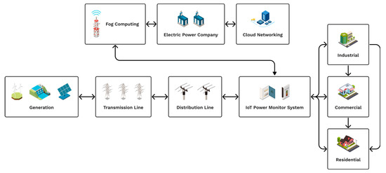These occurrences have technical consequences, involving machine heat damage and insulation decline, among other things, that have a negative influence on electrical and electronic devices, particularly harm to industrial utilities, software for computers, and hardware [7]. Moreover, electrical devices can create chaotic behavior. However, recent research has effectively showed how chaotic phenomena permits addressing energy transmission in networks [8]. Based on the preceding, it is critical to recognize these types of disturbances to determine which measures should be taken to minimize these occurrences. Thus far, classification and detection of disturbances have been recognized as keyways to maintain the quality of electricity. In terms of the smart electrical grid, it is viable to build an Internet of Things (IoT)-based power quality system and place it throughout the line of distribution, with the purpose of transmitting consumption and interruptions information onto utilities over a two-way communications network [9]. A general smart grid structure is presented in Figure 1.