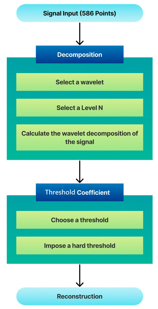 where represents the scale and represents the time-shift. The mother Daubechies wavelet (Db4) was used in this experiment. The decomposition level was set to four, and the threshold value was fixed to 62.91 [37]. The data compression process contained the following steps to achieve efficient compression outcomes, as illustrated in Figure 3.