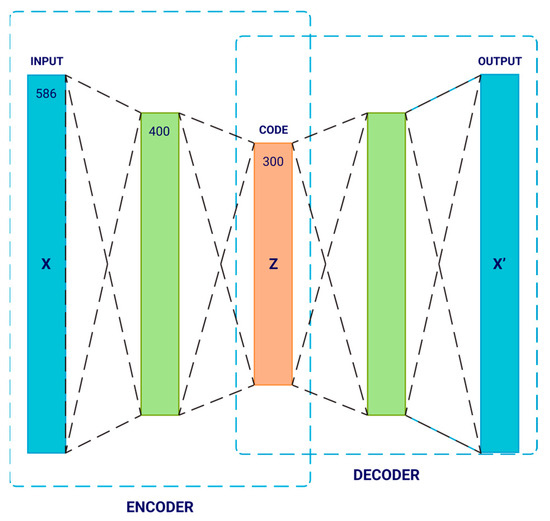 In this scenario, represents the cost function, which can be specified as the squared of error or the cross-entropy functional, amongst other things [38]. Implementation of the autoencoders in Keras will employ a vector of 586 numbers between [0, 1], 400 nodes in the hidden layer, and a code-size of 300.