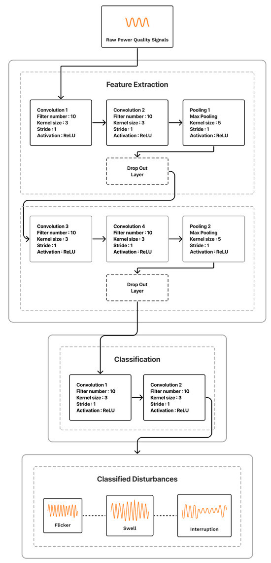 The Hilbert–Huang transform technique was used to identify PQDs, then classified using a multi-layer perceptron neural network (MLPNN) approach [17]. Other research converted signal events into pictures and supplied them into a multi-layer CNN (MLCNN) framework [18]. Simultaneously, some researchers used a 1D deep CNN (dCNN) to assess variables that cause PQDs in microgrids [19].
