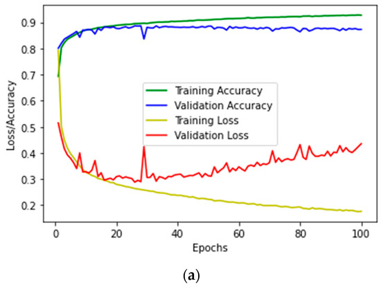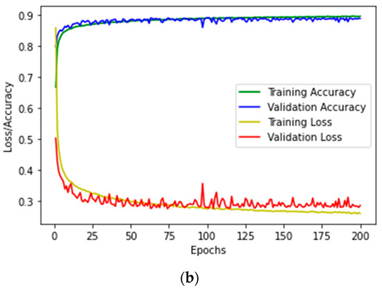 This study presents experimental results of relevant strategies to consider when employing dropout, to prevent overfitting in neural networks in practice. The appropriate dropout rate in this experiment was set to 0.5 for the hidden layer and close to 1.0 for the input layer, as recommended in the original dropout paper [48]. However, this study began with a small dropout value of 20% to 50% neurons, with 20% giving a reasonable beginning point. Generally, a low probability had little effect, whereas a large value caused the network to under-learn. By randomly removing units, the neural network was forced to develop a more robust representation of the data and was prevented from making predictions based on a single neuron. This regularization strategy increased the neural network’s ability to generalize and perform effectively on data, enhancing its accuracy.
