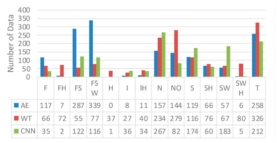 Although each method performed admirably in general, the amount of incorrectly classified instances also determined the efficiency of the classification process. Figure 11 demonstrates in considerable detail, using a bar chart, that wavelet transform had the highest number of classification errors, particularly in seven class labels from fourteen PQD classification categories. This is due to the WT method’s reliance on the appropriate mother wavelet for accuracy, and classification performance depended highly on feature selection and the connected classifier. Furthermore, autoencoder had the most significant number of misclassifications in the following classes: flicker, flicker sag, and flicker swell. Primarily, this is because autoencoder is an unsupervised technique that learns from its data rather than from labels applied by humans. As a result, the autoencoder frequently required a huge amount of clean data to obtain relevant findings. It could produce contradictory answers if the dataset was insufficiently large, unclean, or noisy. CNN, on the other hand, had the fewest incorrectly classified instances. However, some classes, like interruption, normal, sag, and swell had a slightly higher error count than both algorithms.