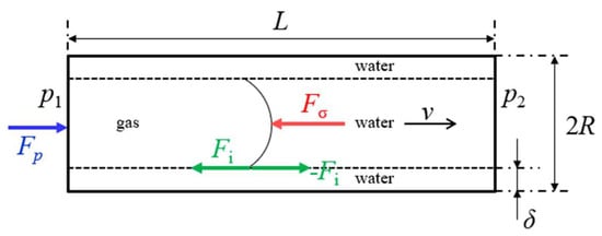 In the figure, Fp is the displacement force caused by the pressure difference, in N; Fσ is the capillary force [22], in N; Fi is the internal friction force, in N; R is the radius of the pipeline, in m; δ is the thickness of the water film, in m; L is the length of the pipeline, in m; and v is the velocity, in m∙s−1.