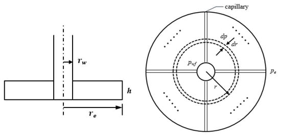 Supposing that in a circular, homogeneous constant pressure boundary formation of the same thickness, N capillary tubes with radius R and length re − rw are distributed along the circumference of the formation (Figure 2), and the porosity is as follows: