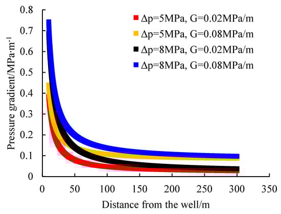 As can be seen from Figure 4, under certain production pressure differential conditions, the displacement pressure gradient within the range of operation increases with the increase in the starting pressure gradient. Under a certain starting pressure gradient condition, the larger the production pressure difference, the larger the displacement pressure gradient in the range of production. Especially in the pre-production area near the well, the difference is more obvious, and the variation range of the displacement pressure gradient in the range of production also increases with the increase in the production pressure difference.