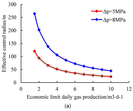 It can be seen from Figure 5a that under certain production pressure differential conditions, the effective control radius of the reservoir gradually decreases with the increase in the economic limit of daily gas production and shows an exponential downward trend. The curves show the same pattern under different production pressure differences. The smaller the production pressure difference is, the smaller the variation range of the effective control radius of the reservoir.