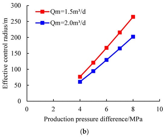 Given a starting pressure gradient of 0.05 MPa∙m−1, the relationship between the effective control radius of the reservoir and the production pressure difference is shown in Figure 5b under different economic limits of daily gas production conditions.