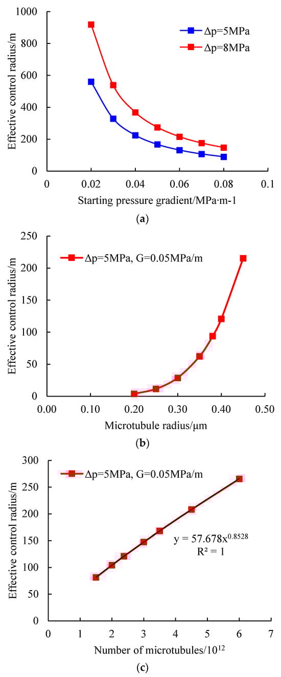 The variation curve of effective control radius under different physical conditions. ((a) Different starting pressure gradients; (b) different microtubule radiuses; (c) different number of microtubules).