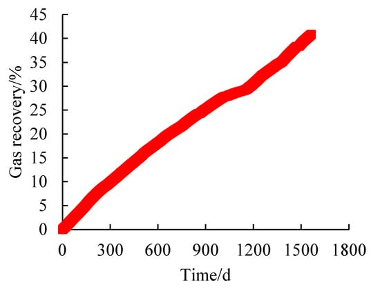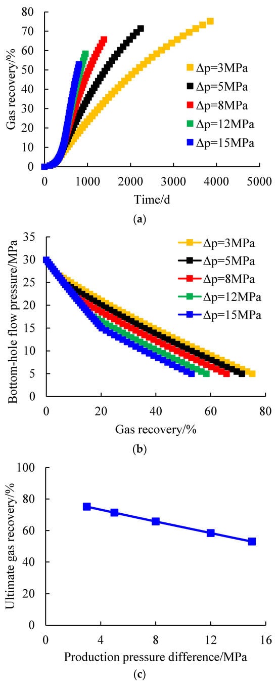 It can be seen from Figure 7a,b that under constant pressure differential production, the greater the production pressure differential, the faster the bottom-hole flow pressure drop, the shorter the time required to reach the abandoned bottom-hole pressure, and the corresponding recovery degree, that is, the smaller the gas recovery. When the production pressure difference is 3 MPa, 5 MPa, 8 MPa, 12 MPa, and 15 MPa, the ultimate gas recovery after reaching the abandoned bottom-hole pressure is 75.18%, 71.40%, 65.78%, 58.42%, and 53.01%, respectively. As can be seen from Figure 7c, the ultimate gas recovery after reaching the abandoned bottom-hole pressure decreases with the increase in the production pressure difference, and the relationship between the two basically satisfies the linear function.
