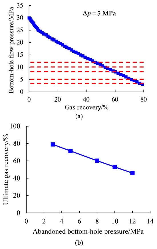As can be seen from Figure 8a, under the condition that the production pressure difference is 5 MPa, the corresponding gas recovery gradually decreases with the increase in the abandoned bottom-hole pressure. When the abandoned bottom-hole pressure is 3 MPa, 5 MPa, 8 MPa, 10 MPa, and 12 MPa, the ultimate gas recovery is 78.98%, 71.40%, 60.25%, 53.01%, and 45.98%, respectively, and the relationship between the ultimate gas recovery and the abandoned bottom-hole pressure basically presents a linear function (Figure 8b).