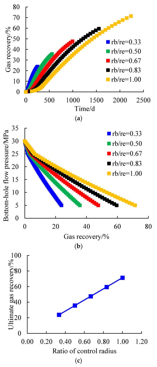 As can be seen from Figure 9a,b, under the condition that the production pressure difference is 5 MPa, the smaller the control radius of a single well, the smaller its ratio to the reservoir radius, the faster the bottom-hole flow pressure drops, and the smaller the gas recovery under the same bottom-hole flow pressure. When the ratio of the control radius is 0.33, 0.50, 0.67, 0.83, and 1.00, the ultimate recovery rate of gas reservoir is 23.78%, 35.69%, 47.59%, 59.49%, and 71.40%, respectively. As can be seen from Figure 9c, the ultimate gas recovery after reaching the abandoned bottom-hole pressure increases with the increase in the ratio of the control radius, and the relationship between the two is in line with a linear function.