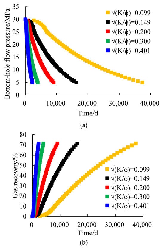 It can be seen from Figure 10a,b that reservoirs with different reservoir quality indexes have the same ultimate gas recovery after production reaches abandoned bottom-hole pressure, but the time required is different. The larger the reservoir quality index is, the faster the bottom-hole flow pressure drops, and the shorter the time required to reach abandoned bottom-hole pressure.
