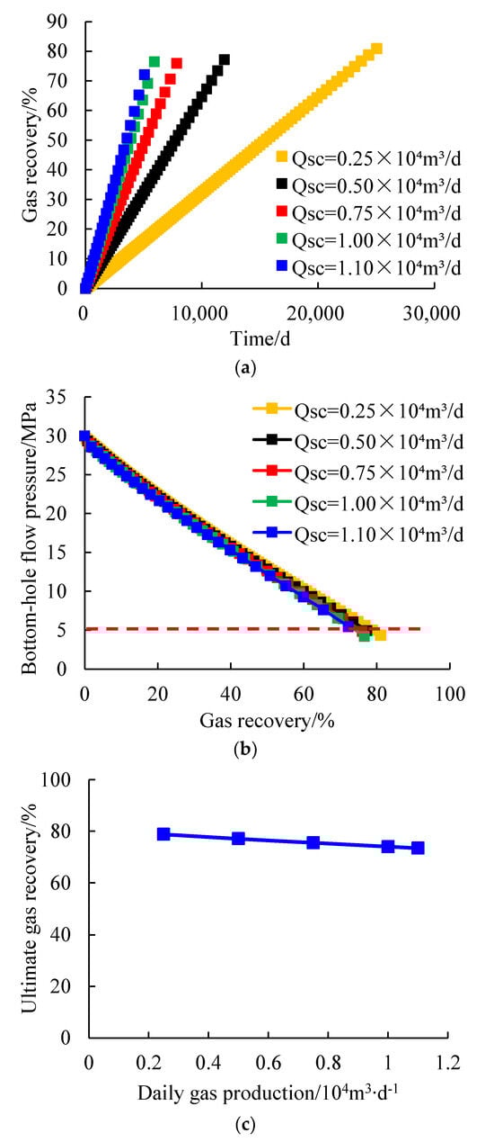 The variation curves of gas recovery with time and bottom-hole flow pressure (Figure 11a,b) were obtained by simulating the production process at a given production rate under different daily gas production limits, and the relationship between the ultimate gas recovery and daily gas production was fitted, as shown in Figure 11c.