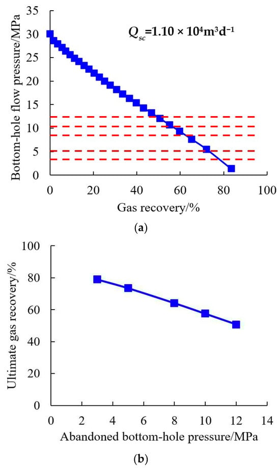As can be seen from Figure 12a, under the condition of daily gas production of 1.10 × 104 m3∙d−1, the corresponding gas recovery gradually decreased with the increase in abandoned bottom-hole pressure. When the abandoned bottom-hole pressure is 3 MPa, 5 MPa, 8 MPa, 10 MPa, and 12 MPa, the ultimate gas recovery is 78.93%, 73.47%, 64.09%, 57.48%, and 50.81%, respectively. The relationship between the ultimate gas recovery and the abandoned bottom-hole pressure basically presents a linear function (Figure 12b).