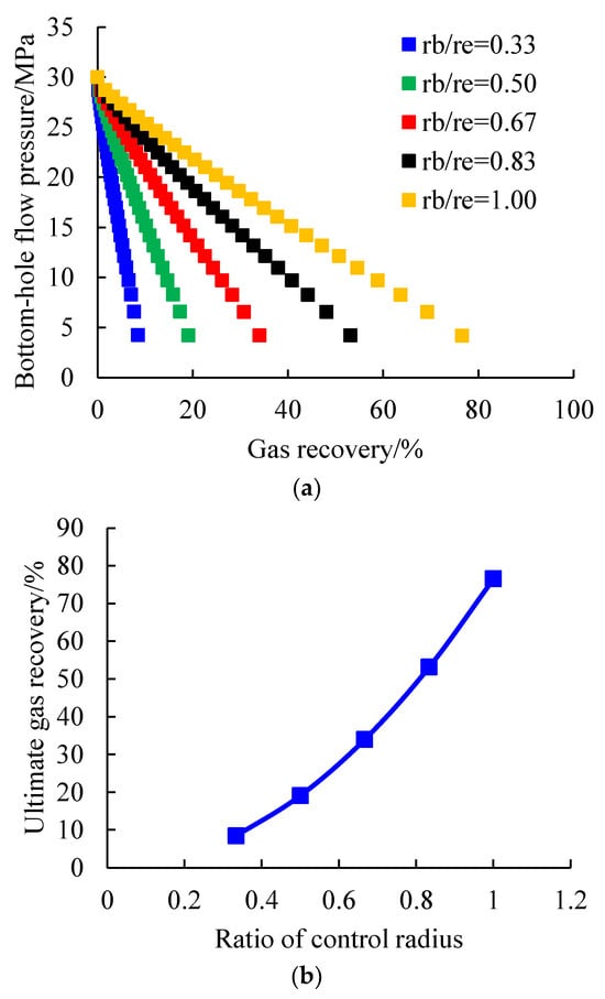 The variation curve of gas recovery at different ratios of the control radius when Qsc = 1.10 × 104 m3∙d−1. ((a) The variation curve of gas recovery with bottom-hole flow pressure; (b) the curve of the relationship between the ultimate gas recovery and the ratio of control radius).