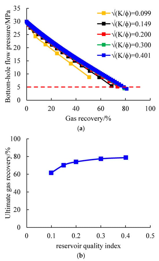 The variation curve of gas recovery at different reservoir quality indexes when Qsc = 1.10 × 104 m3∙d−1. ((a) The variation curve of gas recovery with bottom-hole flow pressure; (b) the curve of the relationship between ultimate gas recovery and reservoir quality index).