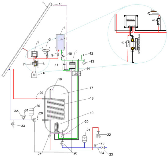 Scheme of PV/T system: 1—photovoltaic-thermal panel; 2—solar charger; 3—communication center; 4—inverter; 5—differential temperature controller; 6—rechargeable battery; 7, 9—fuses; 8—smart shunt; 10, 11—automatic switches; 12—AC outlet; 13—AC bulb; 14—optional power supply; 15—panel temperature sensor; 16—boiler water temperature sensor; 17—electric boiler 120 L; 18—boiler coil; 19—electrical resistance; 20—one-way valve; 21, 30—expansion vessels; 22—hot water outlet; 23, 26, 27, 33—water valves; 24—water meter; 25—thermos manometer; 28, 29—solar aerator; 31—manometer; 32—thermometer.
