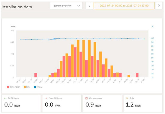 The system operation is visualized in real-time using VictronConnect V 6.0.0. software. On 24 July 2023, the panel produced 1.2 kWh of energy, and the energy consumed was 0.9 kWh, as shown in Figure 5.