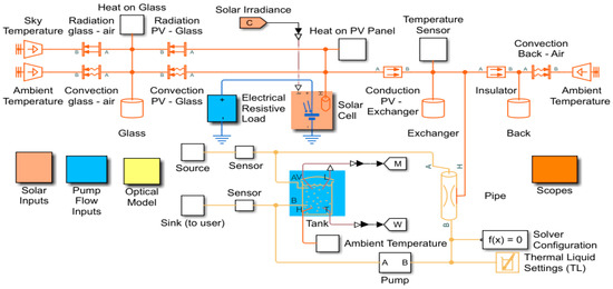 The electrical network part of the PV/T system has a module consisting of 60 solar PV cells connected in series and a resistive load. The thermal network models the heat exchange between the physical components of the PV/T hybrid solar panel (glass cover, heat exchanger, and back cover) and the surrounding environment. Heat exchange within the PV/T solar panel involves conduction, convection, and radiation. The thermal–liquid network encompasses a pipe, a tank, and pumps that control liquid flows within the system. The optical model, embedded in a Matlab Function block, simulates the reflection, absorption, and transmission of light in the glass cover [40].