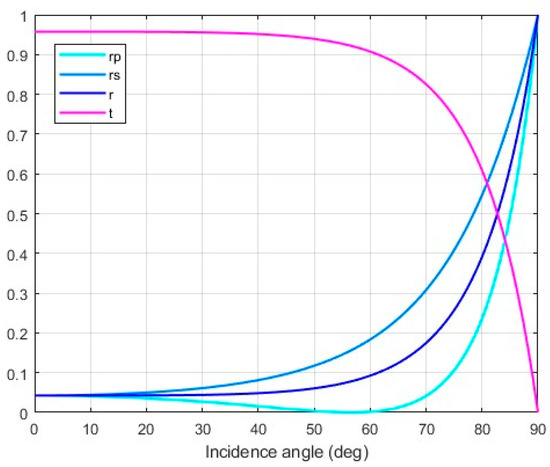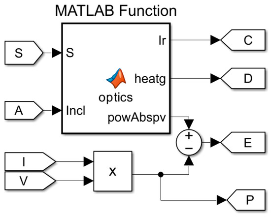The optical model, shown in Figure 7, is based on Fresnel’s laws, which depend on the incident angle of solar radiation. The optical model for the glass cover of a PV/T solar panel is implemented using a Matlab Function block. This model has two solar inputs: irradiation and inclination/incidence angle. It produces three outputs: the transmitted solar irradiance on the PV solar cells, the heat absorbed by the glass cover, and the radiative power absorbed by PV solar cells. This power is then transformed into electrical power (P = V·I) and heat absorbed by the PV solar cells [40].