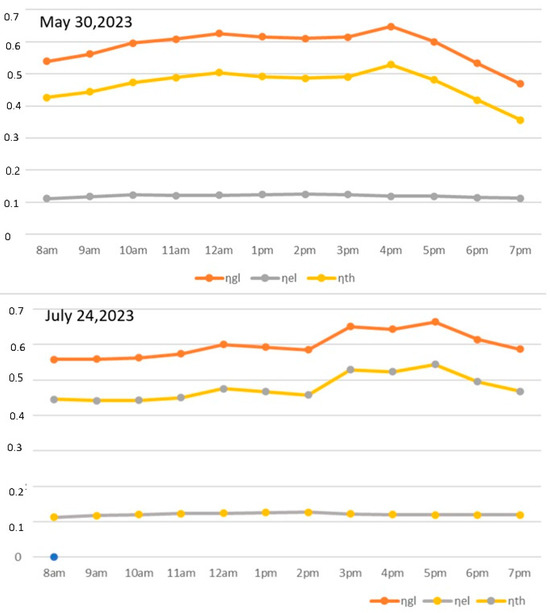 For all 12 measurements conducted on 30 May 2023 and 24 July 2023, covering the entire period between sunrise and sunset, the following average values were obtained for thermal efficiency, electrical efficiency, and global efficiency, as given in Table 10.