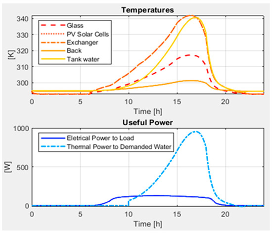 The outputs of model 2 (modeled and simulated in Matlab/Simulink) included temperatures for all components of the PV/T panel, as well as electrical and thermal power. Figure 14 and Figure 15 illustrate the outputs of the PV/T panel, displaying the temperatures of the thermal masses and the useful electrical and thermal power.