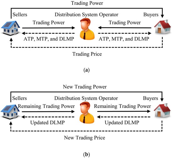 Figure 1. Procedures for operating the P2P energy market: (a) energy trading between sellers and buyers during bidding periods on the P2P energy market and (b) energy trading between sellers and buyers during power exchange periods on the P2P energy market and the DSO’s traditional energy market.