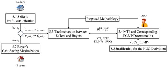 This section explains the interaction between sellers and buyers on a P2P energy market based on the seller’s profit and the buyer’s cost-saving maximization. Thereafter, it is detailed how the proposed method determines the MTP and the corresponding DLMPs of sellers and buyers using an iterative method and a graphical interpretation in conjunction with the fmincon MATLAB optimization toolbox solver (version R2022b). In recovering the DSO’s operational cost, the NUC derivation is finally justified. Each subsection of the proposed methodology is outlined in Figure 2.