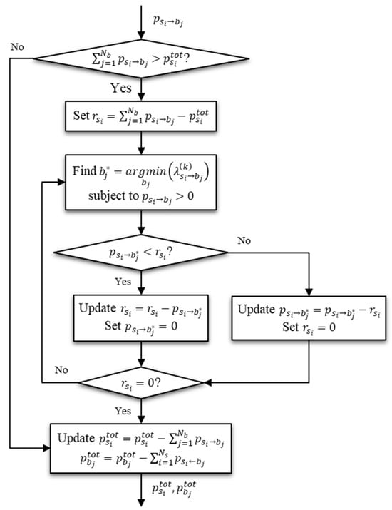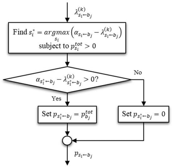 As a response to receiving the trading prices from sellers, the buyers then select a seller. Based on the maximization of cost savings, the buyer b j will choose the seller s i who maximizes the value of the term α s i b j λ s i b j , as depicted in Figure 4. In this case, the buyer b j agrees to trade with the seller s i by setting the total power p b j t o t to the trading power p s i b j . In contrast, if a buyer does not choose a seller, the trading power is set to zero by the buyer. After the selection, the trading power of the buyers is returned to the chosen sellers.
