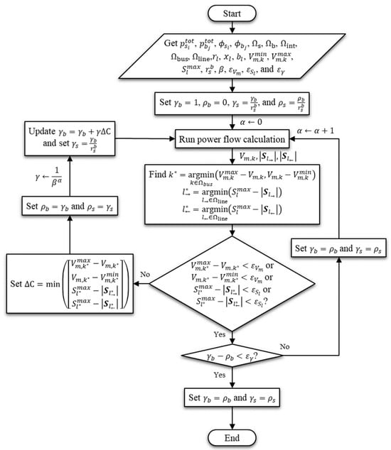 The decision variables of the optimization problem (10) are the scaling factors γ s and γ b , as well as the voltage angles and magnitudes. The MTP of sellers and buyers can be determined by evaluating how much maximum power generation and load consumption can be injected into and consumed from the distribution system without violating the network constraints. The maximum scaling factors that do not cause the distribution system to violate the network constraints are referred to as the limits of the scaling factors γ s l i m and γ b l i m . For this reason, multiplying the limits of the scaling factors by the total power of the sellers and buyers represents the MTP.