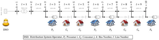 Second, suppose sellers and buyers on the P2P energy trading market have not completed their trades and intend to engage with the DSO. In such a case, the DSO is responsible for clearing the remaining trading power and determining the DLMPs at all buses in the distribution system. These DLMPs are used for trading energy among the remaining sellers and buyers to fulfill the DSO’s traditional energy trading market, which serves as a second energy market of the P2P energy trading market, similarly to [31,32]. The DLMPs represent the trading prices in the traditional energy trading market because they incorporate the outcomes of network constraints. Furthermore, because the DSO is assumed to be able to reserve the remaining power at the slack bus, the DLMPs are calculated as if the slack bus was the marginal bus, meaning it operates below its capacity. Due to the fact that the P2P energy trading market provides a more direct, flexible, and efficient approach to energy trading, the benefits for sellers and buyers on the P2P energy trading market are greater than on the DSO’s traditional energy trading market. Moreover, in the event that the P2P energy trading market is unable to complete the P2P energy transactions according to the total power submitted in Step 1 and the network constraints are not violated, the remaining total power, which lacks energy storage such as batteries, must flow into the distribution system. In such a case, it becomes necessary to engage in trading the remaining total power with the DSO. Consequently, the DSO’s traditional energy trading market is considered the secondary market, where sellers and buyers remaining from the P2P energy trading market are granted the opportunity to trade the remaining total power with the DSO.