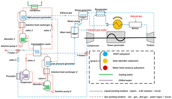 The novel solar hybrid STIGT system consists of three subsystems: the STIGT subsystem, the solar absorber subsystem, and the water/heat recovery subsystem. The principle of the novel system is shown in Figure 1 [25].