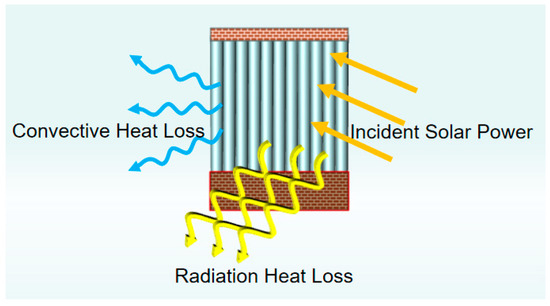 The thermal energy absorbed by the solar absorber and its thermal efficiency is the key to the exit temperature of the work product, which is sufficiently high that the main losses come from radiation with the surroundings and convection (the heat conduction is ignored), as shown in Figure 3.