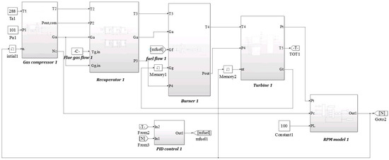 The dynamic simulation model of the gas turbine is established based on Simulink, as shown in Figure 4, which contains the gas compressor, recuperator, burner, turbine, and rotor module, in which the PID controller module controls the rotor speed and the turbine outlet temperature by adjusting the natural gas consumption.