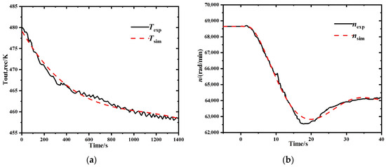 Experimental data of the recuperator and rotating shafts during the step reduction of the load from 78 kW to 60 kW for the T100 micro gas turbine are utilized in this context and compared with the simulated results shown in Figure 5. The A R D between the simulated and experimental values of the recuperator is 1.1%, and the average relative deviation A R D   of the rotor shaft is 0.2%.