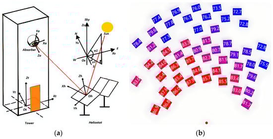 where ε is the surface reflectivity of the heliostat, η c o s , η s h a , η b l o represent the cosine effect and the efficiency of optical losses due to shadowing and blocking, respectively, all as a function of the θ and γ . The azimuthal angle of the heliostat field in the sun-relative tower concentrator system is θ and elevation angle is γ .
