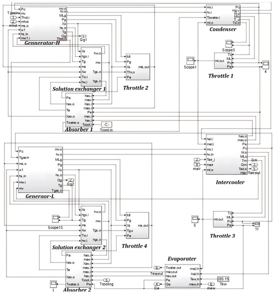 As shown in Figure 6, a dynamic simulation model of a single-effect Li–Br absorption refrigeration unit is developed as the validation of water/heat recovery subsystem, which contains a high-pressure generator, a low-pressure generator, a condenser, an evaporator, two absorbers, two solution heat exchangers, four throttling valves, and an intercooler.