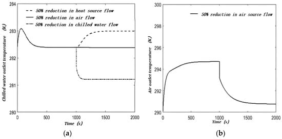 Moreover, the impacts of perturbation of the chilled water flow rate on the system are also investigated. From the air outlet temperature adjustment time in Figure 26a, when the chilled water flow rate steps from 0.4 kg/s to 0.46 kg/s, and the initial value of the T a i r , o u t setting is 14 °C, MDMC is used. By predicting the change of the air flow rate in the time domain in the next 50 s, and analyzing the trajectory of the temperature change in each cycle according to the simulation curve and adjusting the output volume in advance, the output volume will be adjusted in advance after about 14 prediction cycles of 700 s to reach the target temperature value. The dual-loop PID control produces more intense attenuation oscillations in the T a i r , o u t at startup and when disturbed; the number of oscillations reaches four times, and the T a i r , o u t at startup exceeds the target temperature by 2 °C. Compared with the PID control, the MDMC algorithm has more excellent control performance and anti-interference in multiple loops.