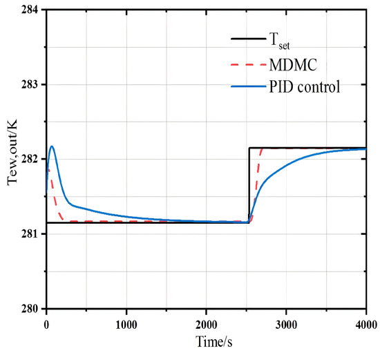 Figure 23. Comparisons of dynamic response between MDMC and PID control under step up of T e w , o u t .
