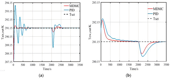 Comparison of the control effect between MDMC and dual-loop PID control was conducted, with the heat source temperature increasing from 70 °C to 80 °C at 2000 s as a step signal input, the air outlet temperature set at 18 °C and remaining unchanged, and the set value of the chilled water outlet temperature remaining at 8 °C.