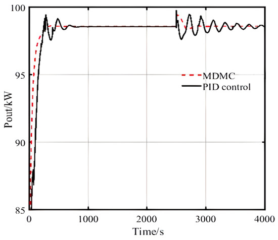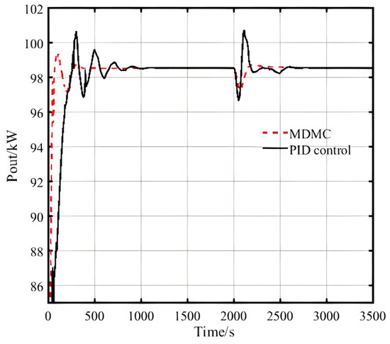 The air inlet temperature of the compressor has crucial impacts on the system output power, and the results are shown in Figure 25. With a target of the air outlet temperature of 18 °C, PID control leads to frequent oscillations of the inlet temperature, resulting in oscillations of the output power between 96 kW and 102 kW, with an overshoot of 2.5% of the rated power, and three oscillation cycle occurs before relatively stabilizing; the time to re-achieve stability is 2000 s. In contrast, the MDMC oscillates by only 0.72%, and takes only one oscillation from startup to stabilization, which is about 1000 s. Although the micro gas turbine has the characteristics of fast response, which means better self-regulation, the frequent oscillations of the inlet temperature are extremely detrimental to the stability of the power generation system.