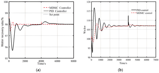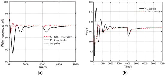 Figure 28. D N I fluctuation by MDMC and PID control: (a) Response of water recovery rate; (b) Response of system output power.